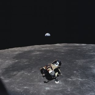The Apollo 11 lunar landing module Eagle, with astronauts Neil Armstrong and Buzz Aldrin aboard, is photographed above the moon by crewmate Michael Collins on the Columbia command module during rendezvous operations on July 21, 1969. The Apollo 11 moon landing, and other NASA Apollo missions, were risky missions for astronauts and the space agency.